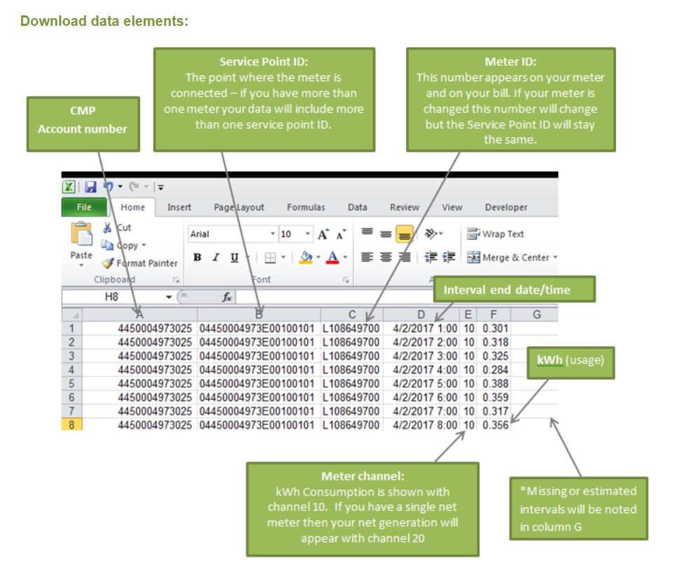 Your data is available in .csv format for your own analysis or in .xml format to be used with Green Button apps that can be found on-line. Two calendar years of data is available, including the current year, and up to 13 months of data can be delivered in a single file. Your Download My Data file will include: