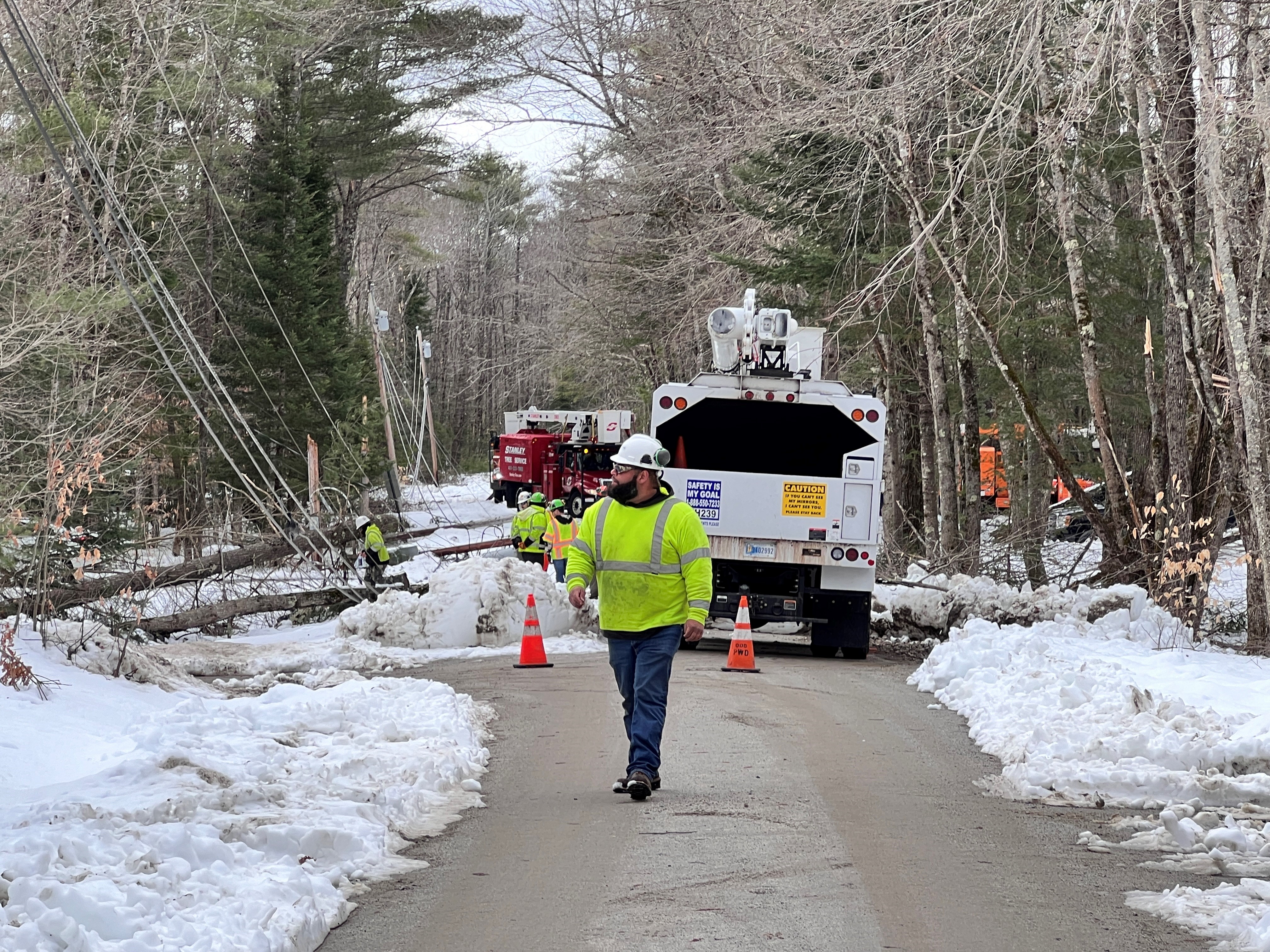 CMP worker walks down road in York County with damage from nor’easter, date: April 7, 2024