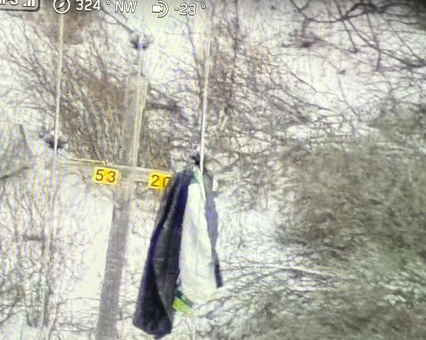 Photo 1: Drone photo of tarp/car cover on transmission line at night
